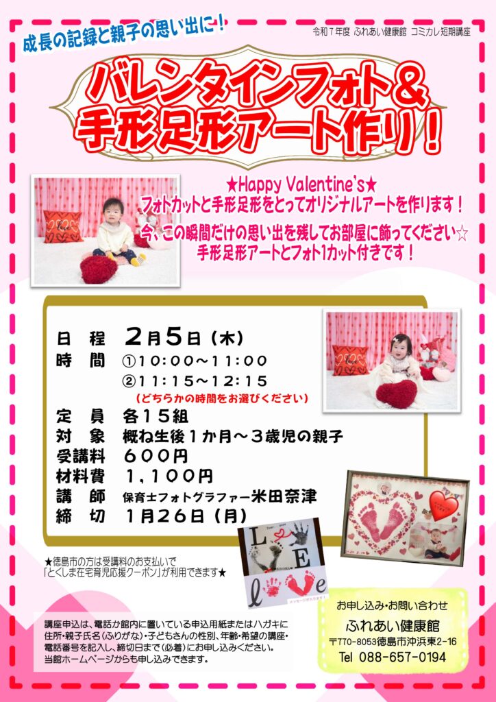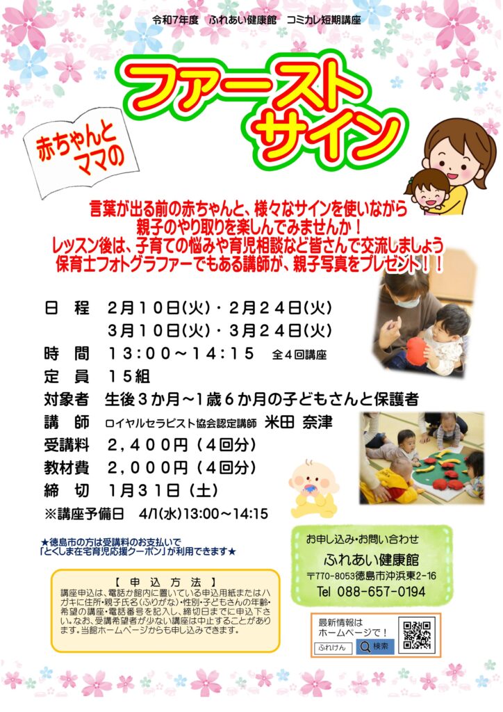 【8年2月開催ベビー講座特集】~産後の骨盤ケア・節分あそび・手形アート・マッサージ・ファーストサイン~ 2026年1月8日 最終更新日時 : 2026年1月8日 ふれけん ふれあい健康館で開催するベビー講座のご案内です! 親子のスキンシップを取ったり、お子様のデリケートなお肌のお手入れ方法などなど、 楽しく学べる講座が満載です(*^-^*) 皆さまのご参加お待ちしております! 【お電話でのお申し込み】 088-657-0194 受付時間:午前9:00~午後9:00(日曜は午前9:00~午後5:00) 【電子申請でのお申し込み】 電子申請は12/15からの受け付けとなります。 【お問い合わせ】 ふれあい健康館 2階事務室(088)657-0194