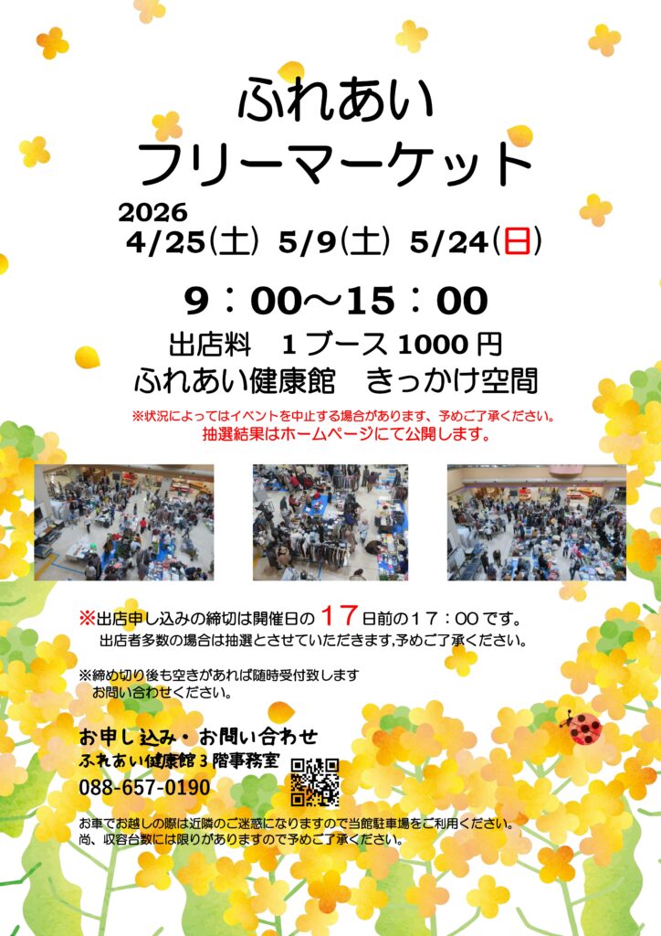 ふれあいフリーマーケット2026年4月~5月 2026年4月9日 最終更新日時 : 2026年4月9日 ふれけん ★ふれあいフリーマーケット出店者募集★出店料は1ブース1000円詳しくは下記の電話番号までお問い合わせ下さい℡:088-657-0190 当日お車でお越しの際は近隣のご迷惑になりますので当館駐車場をご利用ください。 尚、収容台数には限りがありますので予めご了承ください。 ※当日は感染予防の為、手指の消毒の徹底をお願いいたします。※状況によってはイベントを中止する場合があります、ご了承ください。