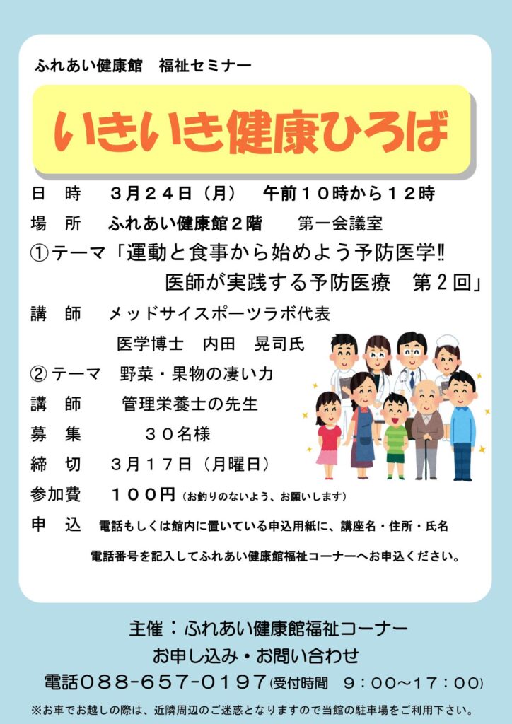 令和7年3月24日(月) いきいき健康ひろば 2025年2月17日 最終更新日時 : 2025年2月19日 ふれけん ふれあい健康館福祉コーナーからご案内です。3月24日(月)午前10時~12時 ふれあい健康館2階第一会議室にて専門家を招いて「いきいき健康ひろば」を実施します。参加料100円 皆様のご参加をお待ちしております。