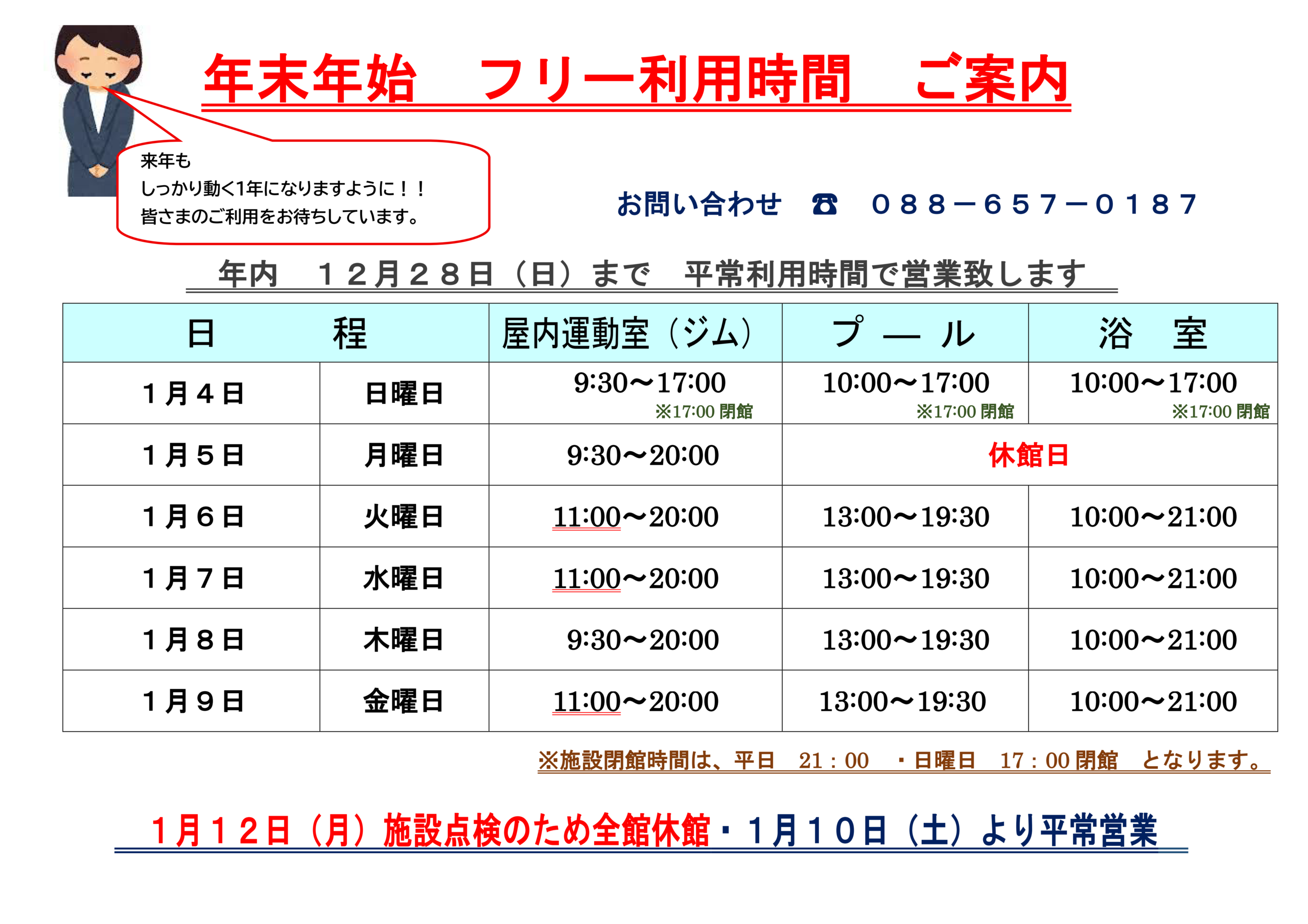 屋内運動室・健康保養浴場(プール・浴室)年末年始 フリー利用時間 ご案内 2025年12月10日 最終更新日時 : 2025年12月10日 ふれけん 屋内運動室(トレーニングジム)・健康保養浴場(プール・浴室)は12月29日(月)~1月3日(土)の期間施設休館となります。 1月4日(日)~新年の営業が始まります。皆様のご利用をお待ちしています。詳しい利用時間をご覧ください。