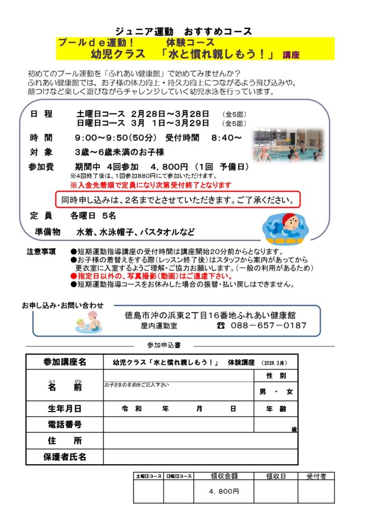 プールde運動 幼児クラス「水と慣れ親しもう!」 2026年2月8日 最終更新日時 : 2026年2月8日 ふれけん はじめての水泳教室をふれあい健康館のプールで体験してみませんか? お子さまの体力向上や、協調性を高めるなど水泳教室には利点がたくさんあります。 お申し込みを希望される方は ふれあい健康館 屋内運動室(ジム)受付まで(088-657-0187)