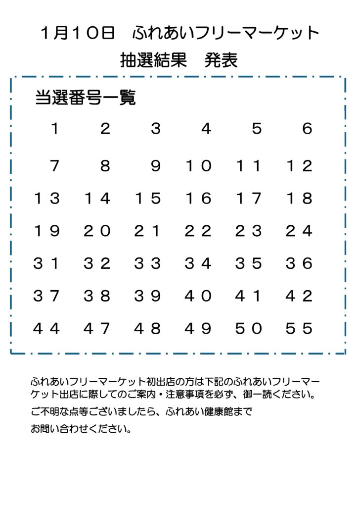 2026年1月10日開催ふれあいフリーマーケット 抽選結果 2025年12月25日 最終更新日時 : 2025年12月24日 ふれけん 事前入金期間は 1月 4日 10:00 〜 1月7 日 17:00 です。※年末年始のお休みがありますので、通常の期間より短くなっております、ご注意ください。落選となった方はキャンセル待ちとなります、キャンセルが出ましたらご連絡いたします。 ふれあいフリーマーケットご案内・注意事項は下のPDFからご覧ください。