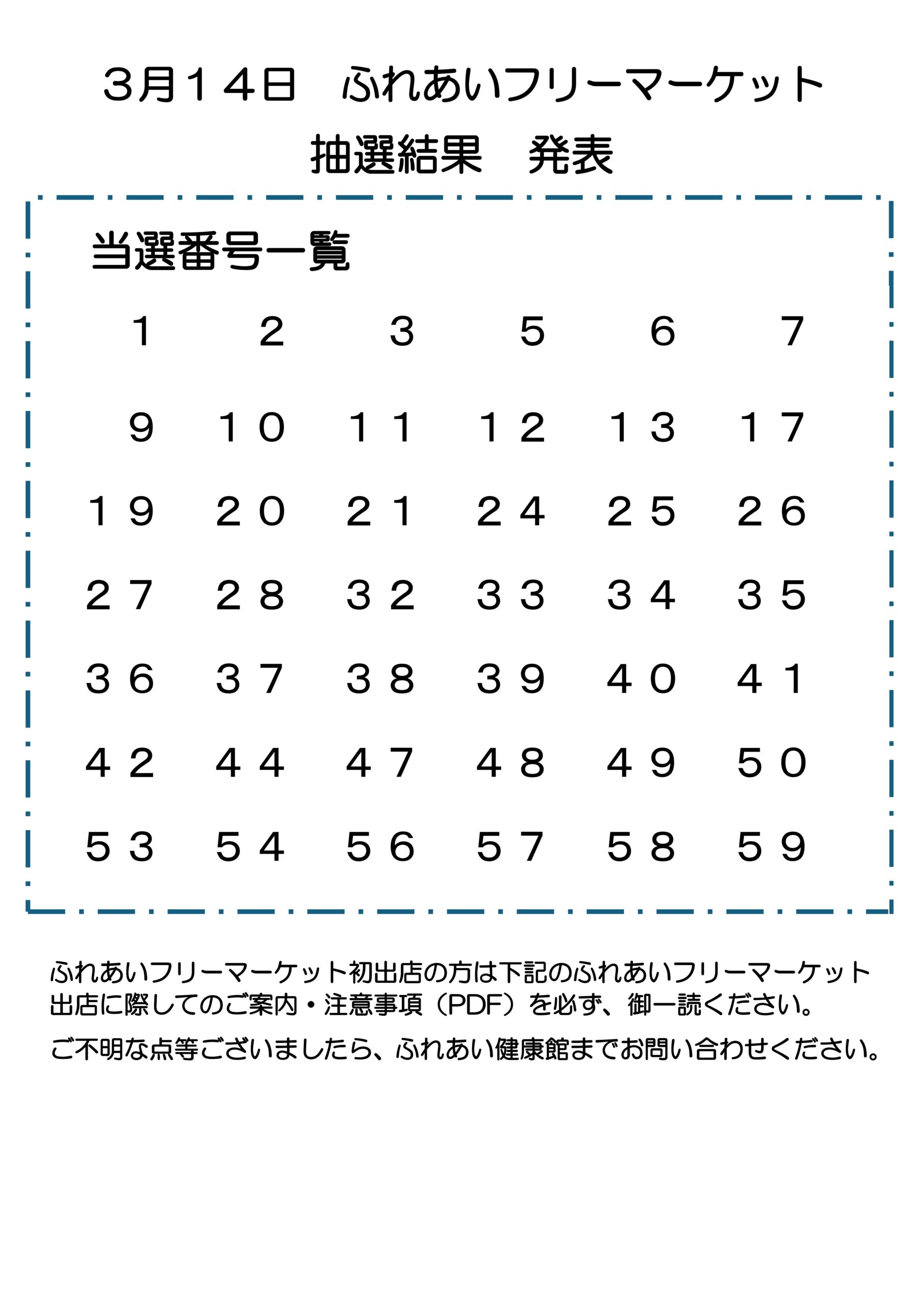 3月14日 ふれあいフリーマーケット抽選結果 2026年2月26日 最終更新日時 : 2026年2月25日 ふれけん 事前入金期間は3月4日 10:00 〜3月11日 17:00 です。この間に出店料をお支払いいただくと、その時点で開いているブースをお選びいただけます。落選となった方はキャンセル待ちとなります、キャンセルが出ましたらご連絡いたします。 ふれあいフリーマーケットご案内・注意事項は下のPDFからご覧ください。
