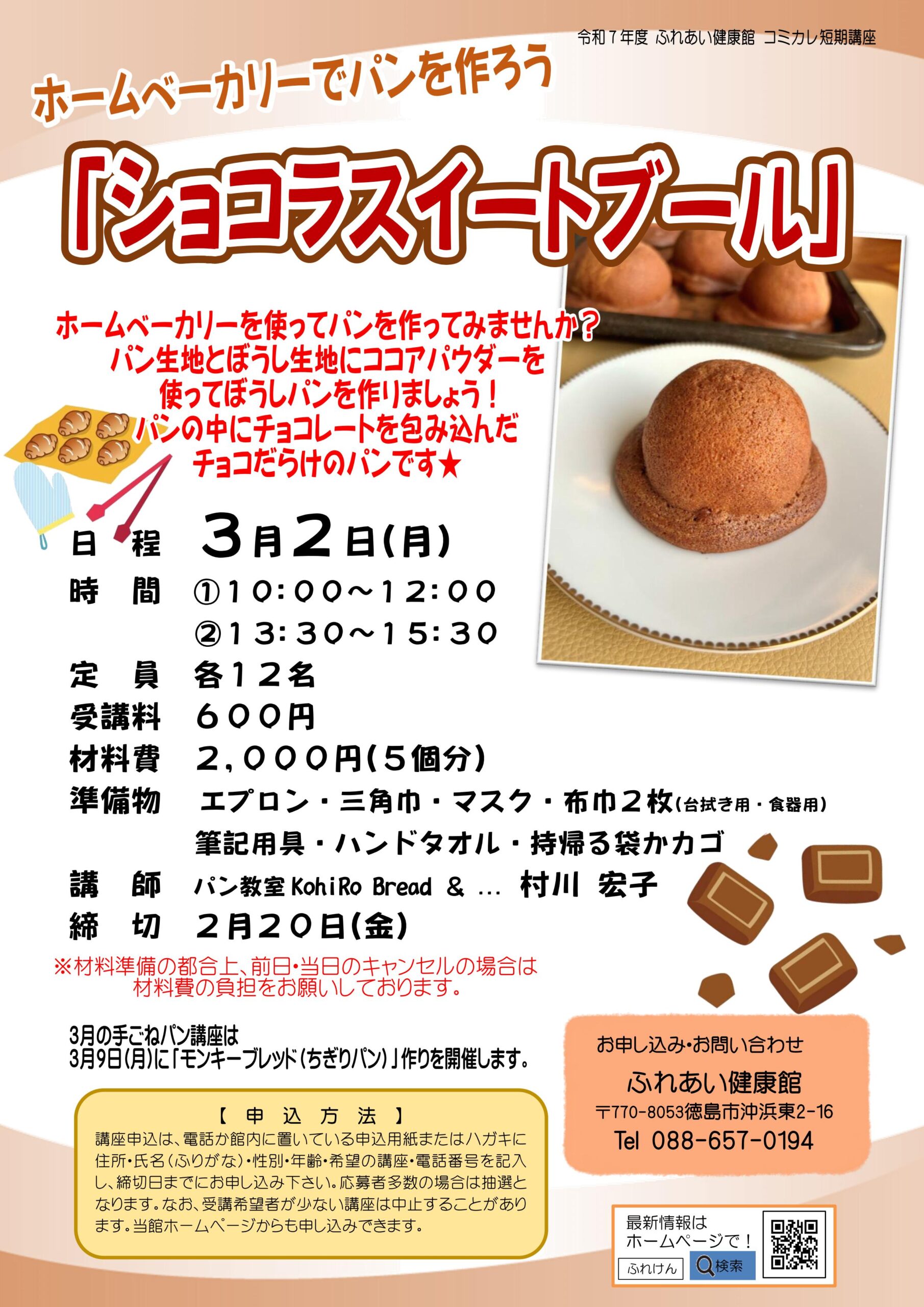 チョコだらけのぼうしパン「ショコラスイートブール」を作る講座と、