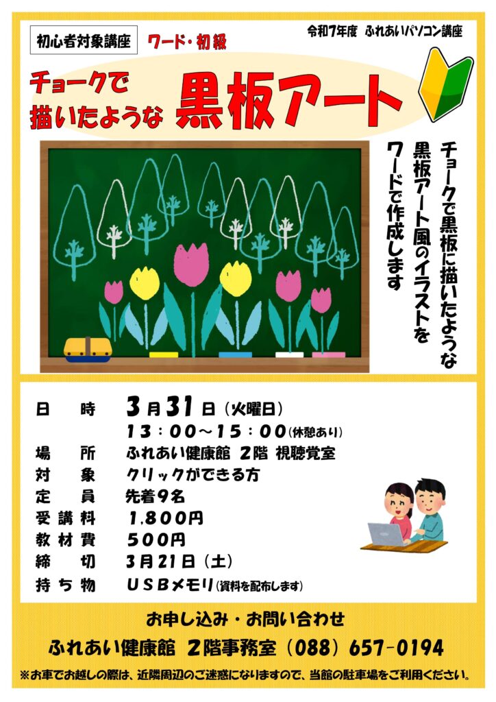 パソコンのワード機能を使ってチョークで描いたような黒板アートを作る講座などを開催いたします。