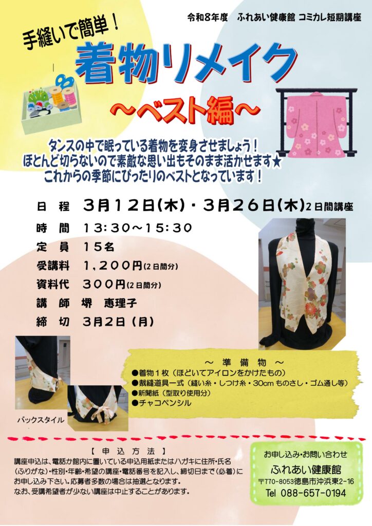 3月12日(木)~ 着物リメイク《ベスト編》 2026年3月3日 最終更新日時 : 2026年3月3日 ふれけん タンスの中で眠ったままになっている着物を、おしゃれなベストにリメイクしてみませんか? これからの季節のおでかけにもピッタリですよ。 お申し込みをお待ちしております。 【お電話でのお申し込み】 ☎088-657-0194 受付時間:午前9:00~午後9:00(日曜は午前9:00~午後5:00) 【電子申請でのお申し込み】 【お問い合わせ】 ふれあい健康館 2階事務室(088)657-0194