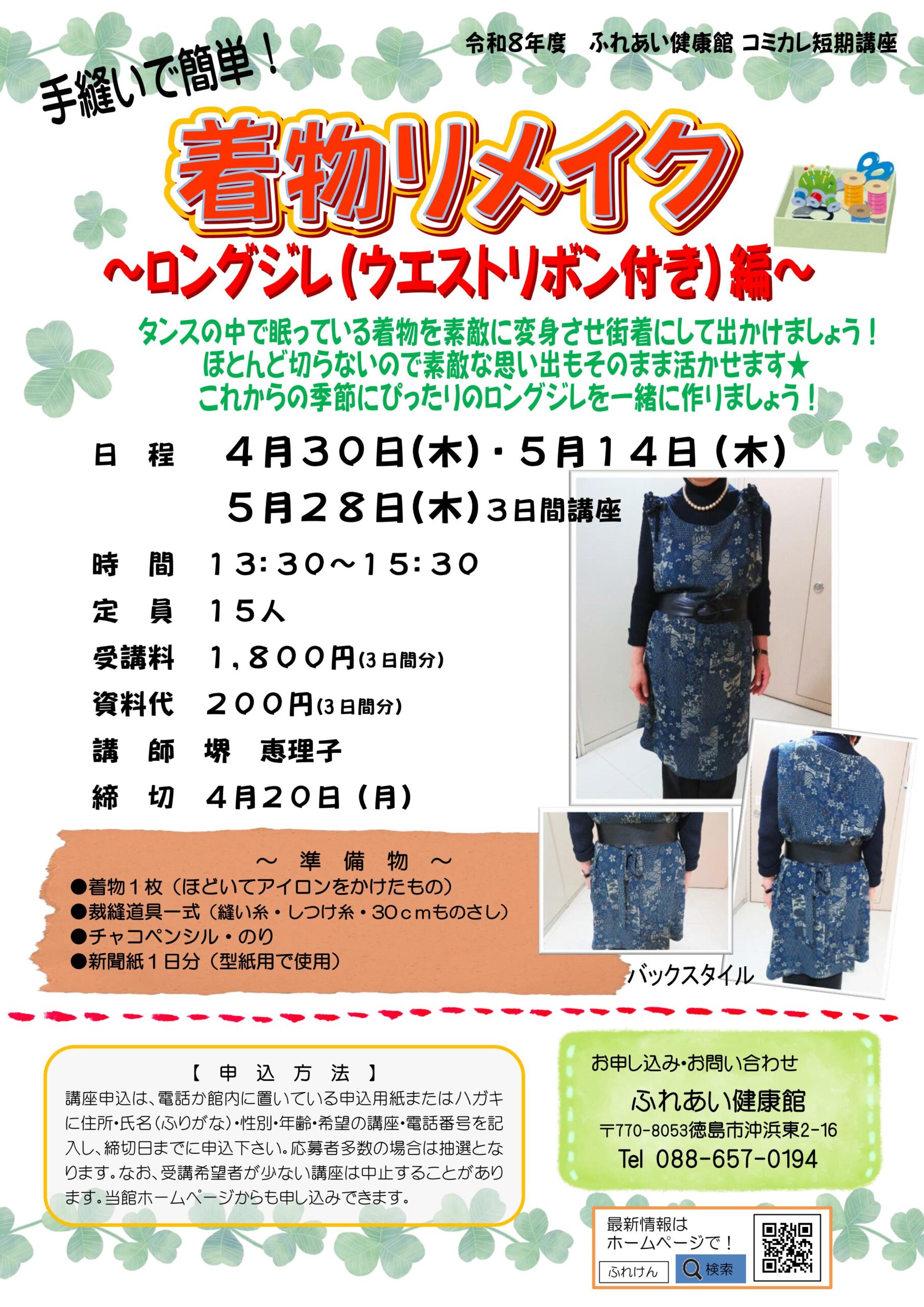 4月30日(木)~ 手縫いで簡単!着物リメイク《ロングジレ編》 2026年3月14日 最終更新日時 : 2026年3月14日 ふれけん タンスの中で眠ったままになっている着物を、ウエストリボン付きのおしゃれなロングジレに リメイクしてみませんか? これからの季節のおでかけにもピッタリですよ。 お申し込みをお待ちしております。 【お電話でのお申し込み】 ☎088-657-0194 受付時間:午前9:00~午後9:00(日曜は午前9:00~午後5:00) 【電子申請でのお申し込み】 【お問い合わせ】 ふれあい健康館 2階事務室(088)657-0194